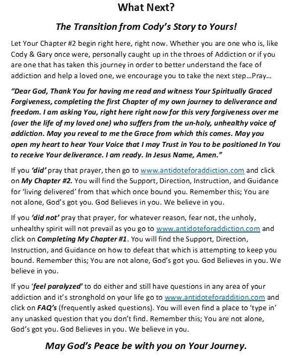 Whether you are one who is like Cody & Gary once were, personally caught up in the throes of Addiction, or if you are one that has taken this journey in order to better understand the face of addiction and help a loved one, we encourage you to take the next step…Pray…